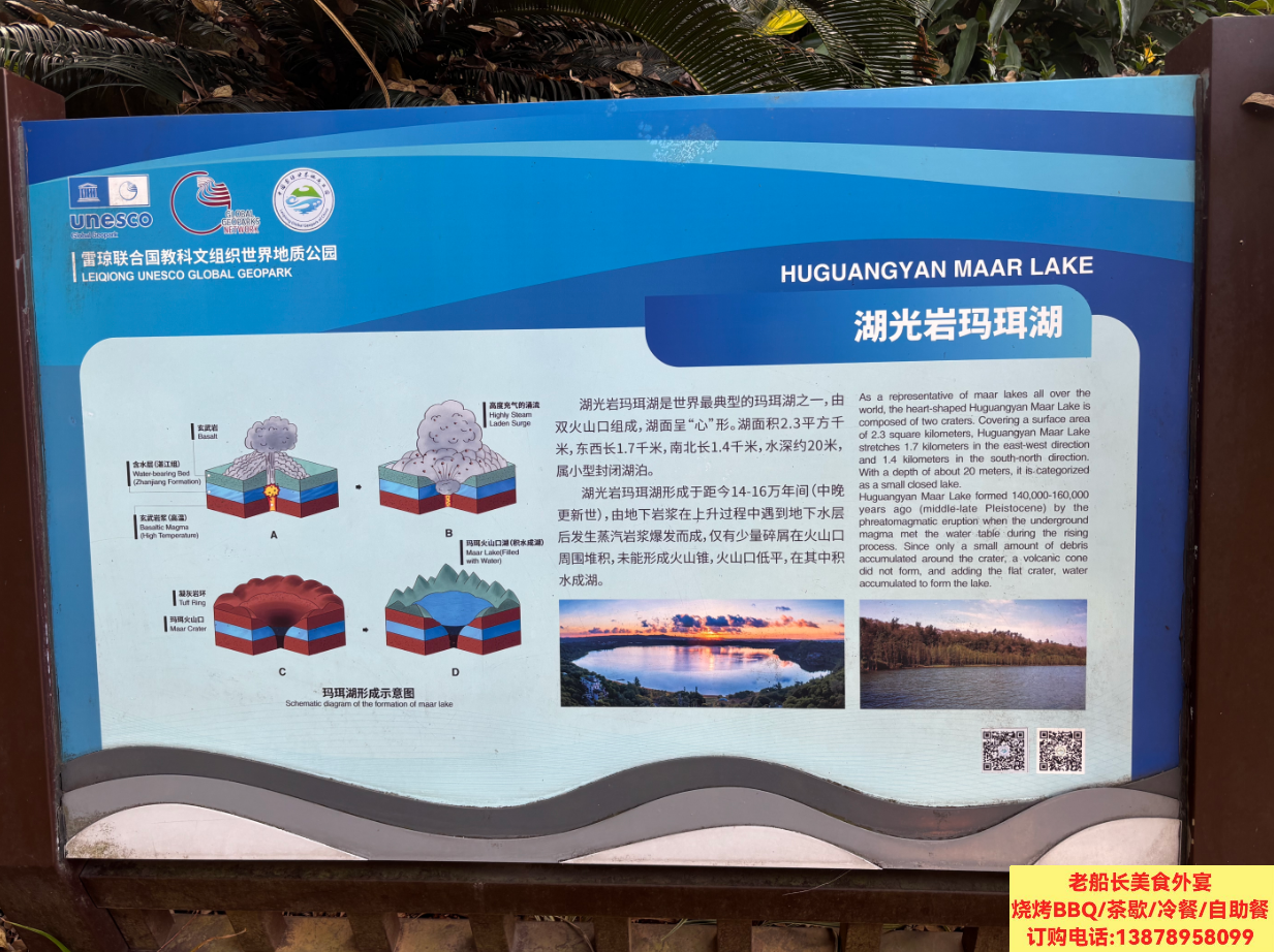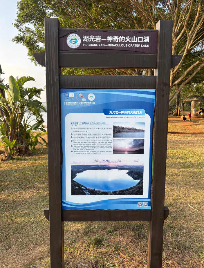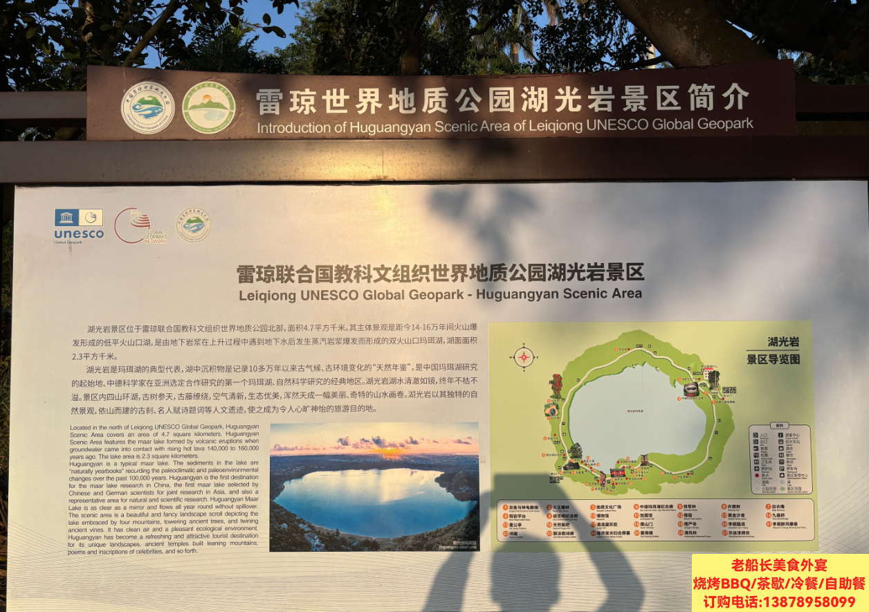 湖光岩景区位于广东省湛江市麻章区雷琼联合国教科文组织世界地质公园北部,毗邻广东海洋大学,是国家AAAA级旅游区,其主体景观是距今14-16 年间火山爆发形成的低平火山口湖,呈心形,东西长1.7千米,南北长1.4千米,面积13.6平方公里,湖面积2.23平方公里,是中国唯一的一座玛珥湖景区。火山口低平,在其中积水成湖,湖水清澈,湖面明净,湖光山色,风光迤逦,湖光岩是中国玛珥湖的起源地,蕴藏着丰富的热、带亚热带气候环境信息,是一个天然的自然博物馆,火山岩土地肥沃,众多动植物在此繁衍生息,其中植物种类高达593种。湖光岩湖水清澈如许,终年不枯不竭,景区内四山环湖,古树参天,古藤燎绕,空气清新,负离子含量极高,生态优美,浑然天成一幅美丽奇特的山水画面。游光岩以其独特的自然景观,依山而建的古刹,名人赋诗题词等人文遗迹,使之成为令人心旷神怕的旅游目的地。