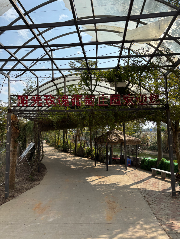 湛江阳光玫瑰葡萄庄园是湛江市最大的葡萄栽种基地,地址位于湛江市坡头区坡头镇九有村,距离市区车程仅20分钟。园内开发面积约1000亩,其中种植葡萄200多亩,有阳光葡萄、夏黑、巨峰、蓝黑四个品种。同时种植有芒果、青枣、杨桃、红橙、黄皮果、草莓、圣女果、人参果、菠萝蜜等十多种热带水果。园区采用“公司+基地+农户”模式,致力于打造以“餐饮、民宿、生态养殖、桃花岛、百香果道、观光荷花渠、花海”为一体的现代农业休闲旅游产业,是湛江市民休闲娱乐、观光采摘、研学实践的重要基地。园区目前已获得广东省科普教育基地、广东省休闲农业与乡村旅游示范点等荣誉称号。